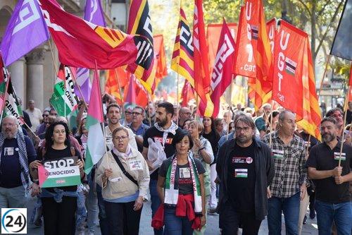 Cientos de manifestantes en Barcelona demandan una paz sostenible para Gaza, convocados por CC.OO. y UGT.